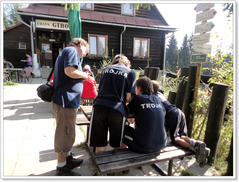 Když nás ráno v neděli vysypal autobus před nádražím (mně a Lálu), vítá nás právě odcházevší Marťan (otec Jacka) se slovy, že už tam je několik vedoucích. Prý nějaký brýlatý, kudrnatý a jeden dlouhovlasý. Tak jsem přemílal kdo by to mohl být, abych vzápětí seznal, že oddíl už „richtují“ Maco a Harry. V cuku letu vybíráme penízky na jízdné. Rysům chybí Dragon, Orel a Runy. Lišáci hlásí 100% účast. Kubula oznamuje, že Lvíče nemůže, protože hlídá psy babičce. Sochor se má připojit až v Mostech, kde je s rodiči na chatě. Racek Kulajda je zde s celou rodinou. Tak jsem se ho obligátně zeptal, kam že to jedou. A on mi odpověděl, že na Gírovou. „No, tak to se tam setkáme!“ (No to se rozumí, že Kulajdovci jedou s námi!)