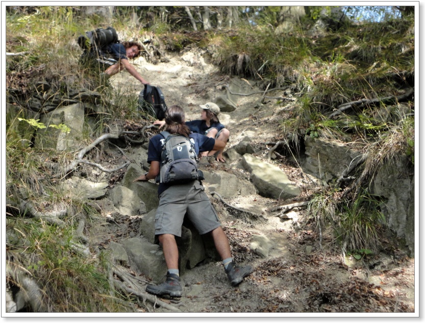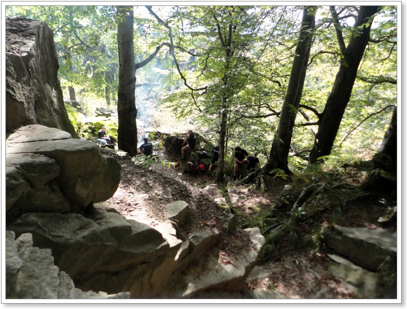 Zatímco si družiny mordují své hlavy při luštění "zapeklitých" zpráv, "panťák" si to letí do podhůří Beskyd. Za okny se trhá ranní mlha, občas probubnována betonovými stěnami nově budovaného rychlostního koridoru a vstávajícím ranním sluncem. Tady ve vagónu je příjemně, ale otevři si okno a dostaneš pleskanec studeného vzduchu. "Čápovice" - hlásí Mona. "Půjdeme do sedel!". Družiny odevzdávají výsledky svého snažení. Ani Modří racci se nijak nevyznamenali. Souprava zvolna vjíždí do pohraniční stanice Mosty u Jablunkova. Sypeme se ven z vagónu. Vítá nás Sochor od Vyder. Danny si bleskově navléká oddílovou mikinu. Vojtíšek má pletené rukavice. Závidíme. Je nádherné podzimní ráno!! Jak z obrázků skautského kreslíře Pierra Jouberta! (Nohy vydrží vše, ne tak ledviny, uši a dlaně!)