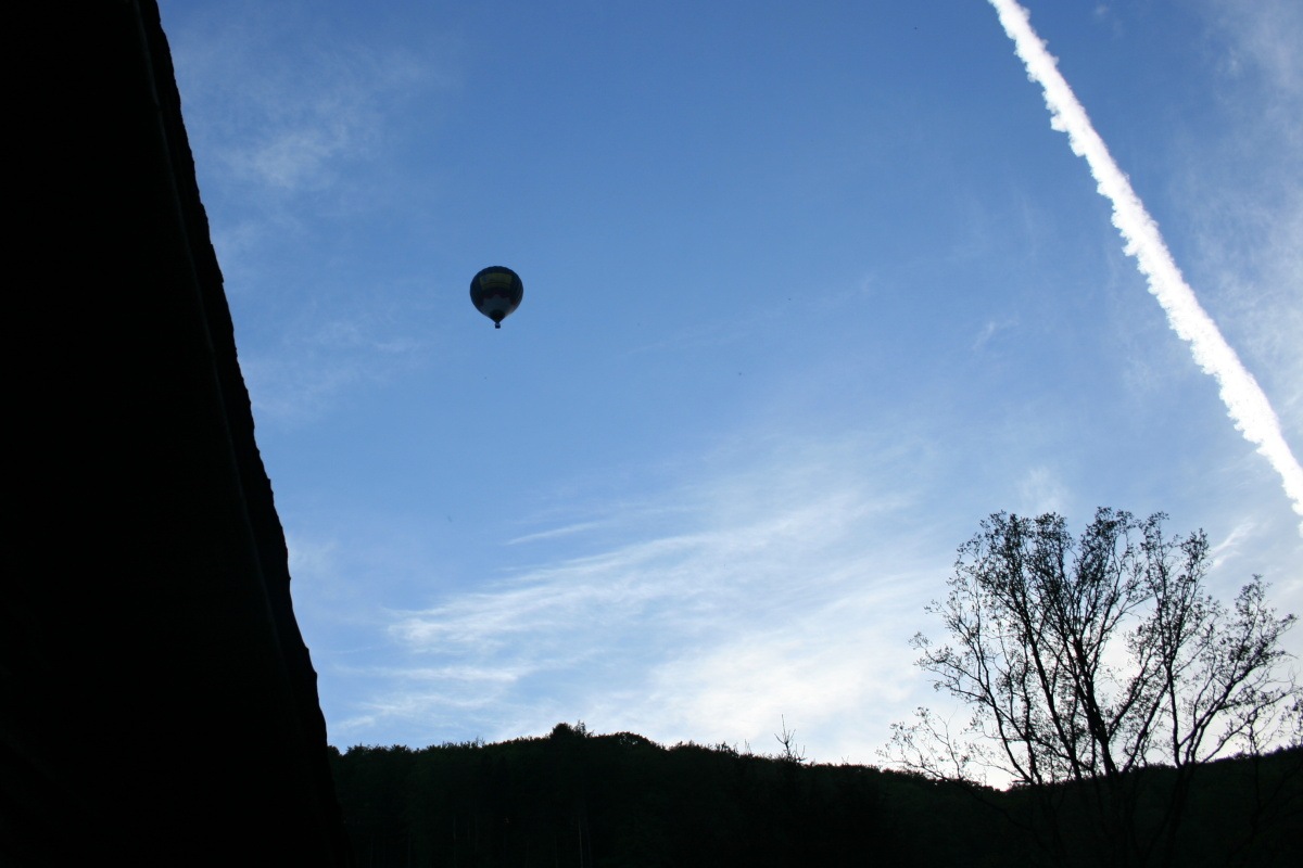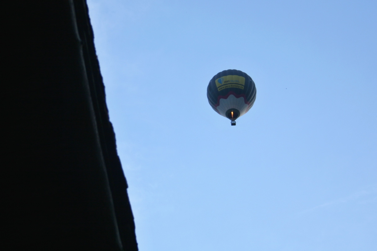 V průběhu těchto všeobecně prospěšných prací se ozývá z Marošova betonového chodníčku bujaré veselí. Na obloze majestátně pluje horkovzdušný balón společnosti JARO balóny, takříkajíc na dosah ruky. Hned jsem si vzpomněl na tábor. Osazenstvo koše dokonce hochům zamávalo! Několikráte se ozval hukot hořáku a oranžový plamen ozářil spodní partie balónu a po chvíli se pomalu ztratil za hradbou stromů na hřebenu Sušice.
