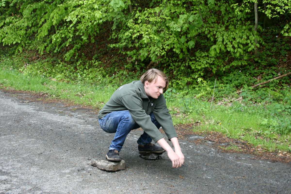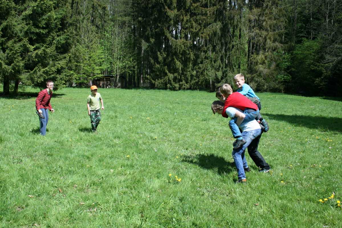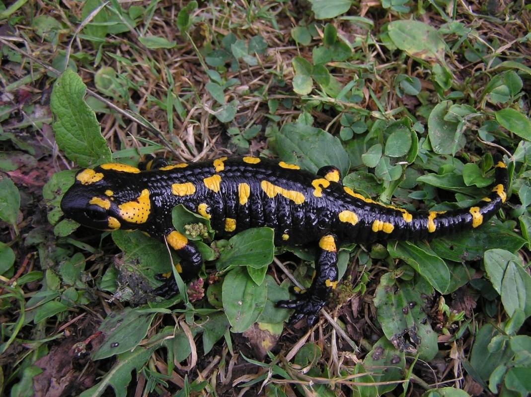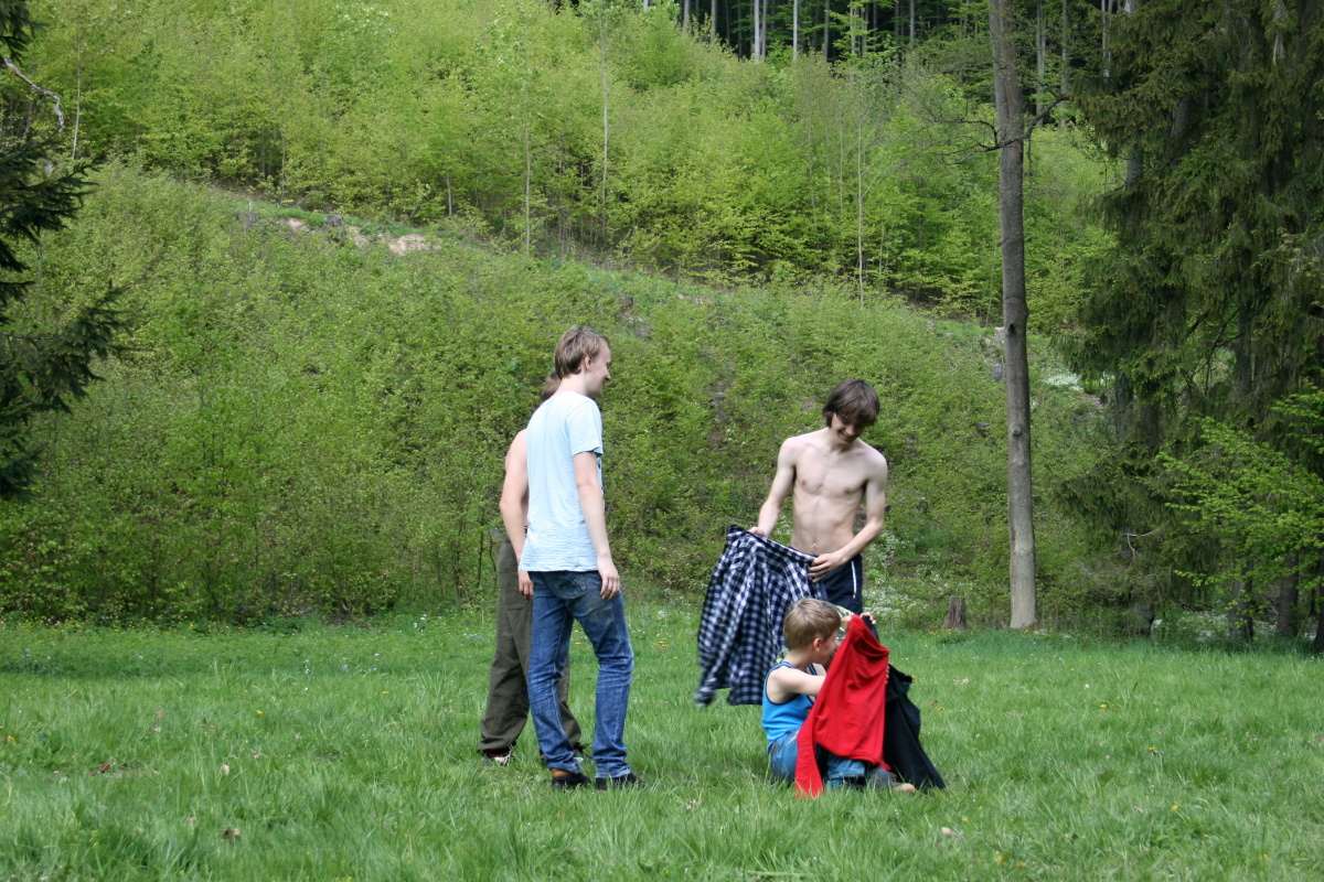 My se jdeme projít po vrstevnicové cestě nad táborem. Nadík chce vidět břízy, které jsou nejblíže Tvrzi a jež několikráte marně hledal. Později se přiznal, že "tak daleko" nikdy nedošel. Téměř na každém kroku volá někdo z hochů, že objevil dalšího salamandra! Dokonce jsme je začali počítat a napočítali jsme jich 26!! Asi se jim dobře daří, takhle po dešti! Díváme se ze svahu na tábořiště s Tvrzí. Cestou hochům určuji různé kytky. Jedna ze soutěží přece bude i botanika!