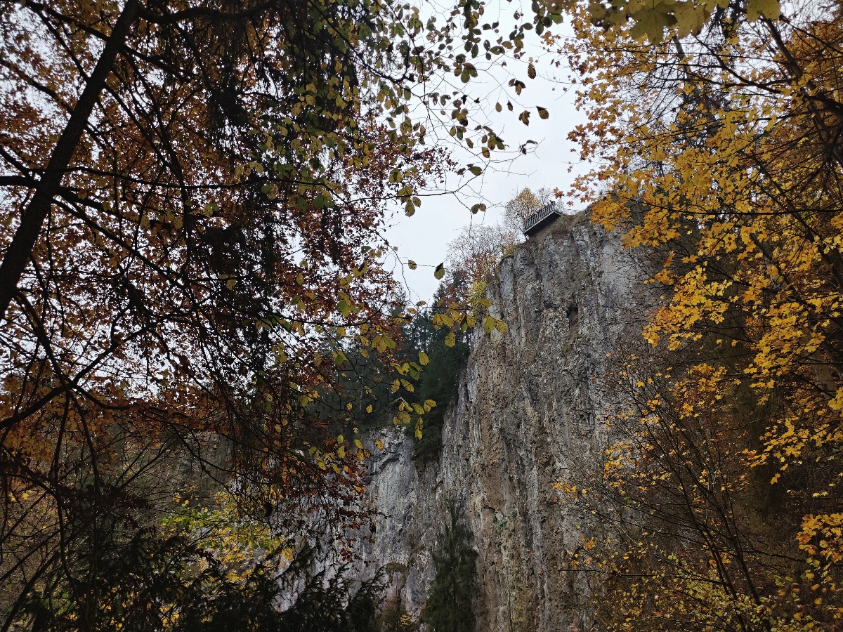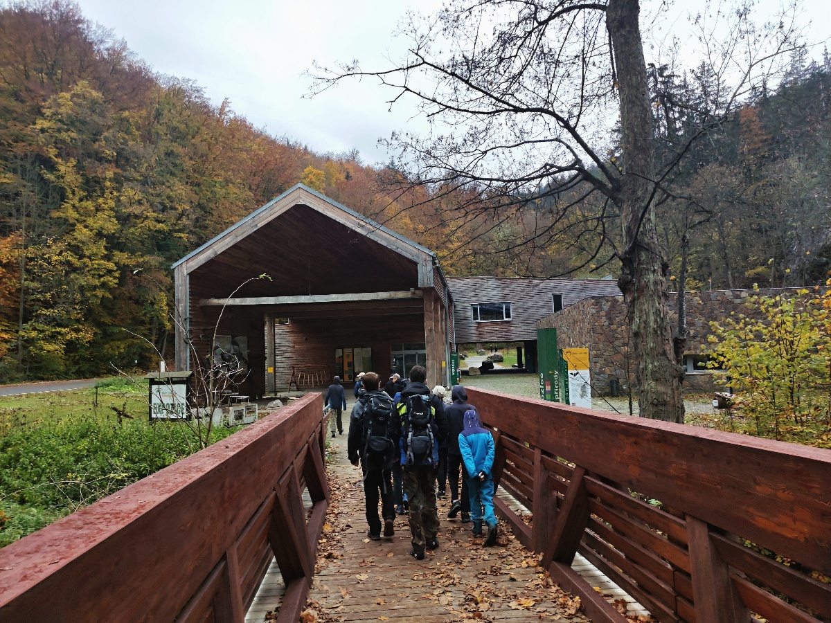 Po nedlouhé jízdě se ocitáme před hotelem Skalní mlýn, původním vodním mlýnem, poháněném vodami říčky Punkvy. Zde se dlouho nezdržujeme a přesunujeme se k Domu přírody Moravského krasu. Je ještě zavřeno, ale to nám nevadí, stejně bychom dovnitř nešli. Hoši namísto toho důkladně prozkoumali názorný vodní model průtoku vody Moravským krasem a Kayak s Krokym se pokoušeli zahrát ovčáky čtveráky na zavěšených dřevěných kolících různých druhů dřevin. Tak, to by stačilo, vyrážíme! Zanedlouho začínáme stoupat. Cílem je horní můstek propasti Macocha. U odpočívky u Křenkova pomníku jsme oduzlovali Kombinované uzlování (V, L, R). Přicházíme na Macochu a, mě snad picne, akorát se potkáváme se zájezdem Poláků. Ti naštěstí rychle opouští Horní můstek a my se tak můžeme pokochat pohledem do propasti. „Wyjazd“ však rychle docházíme ještě na Dolním můstku. Začíná pršet, no, to nevypadá dobře. Mezi Poláky se různě proplétáme při sestupu do Punkevního žlebu. Není divu, mokré kamenné podloží, pokryté vrstvou spadaného podzimního listí, poměrně slušně klouže. Paolo si obléká pláštěnku – má totiž jen mikinu. Prý nemá bundu vůbec s sebou na výpravě!! Poláci pokračují po cestě dolů, zřejmě se nechají vyvézt lanovkou zpět nahoru na Macochu. Ne tak my! My začínáme, k menší nevoli několika hochů, opět stoupat. Chci totiž hochy zavést na Blansek, zříceninu rozsáhlého hradu. Ten leží mimo populární profláknuté trasy a těžko by ho kdo navštívil při rodinném výletu. Stále prší. Po zkontrolování jízdního řádu v mobilu rozhoduji, že výpravu zkrátíme a odjedeme na základnu již před polednem, a to z Nových dvorů.
