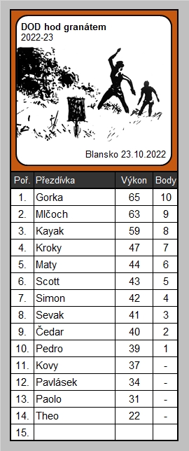 Ráno vstáváme o půl osmé. Po snídani je vydán pokyn ke sbalení všech osobních věcí tak abychom v cestovním oblečení mohli vyrazit ven a po návratu se mohli rovnou vrhnout na oběd a úklid. Naposledy se vydáváme do Blanenských ulic. Kolem dřevěného kostelíka Sv. Paraskivy, který byl původně postaven na Podkarpatské Rusi a na současné místo dovezen po železnici (podrobnosti zde), který byl tentokráte při konání mše uzavřen, procházíme k zámku a zastavujeme se v zámecké zahradě. Zde nejprve házíme granátem do DOD. Sice je ještě říjen, ale slib je slib. Každý má sérii 25 hodů (pět hodů z pěti míst). V poslední sérii se hází dokonce z prolézačky dětského hřiště. Deset bodů do DOD si za první místo vyházel s 65 body Gorka, další pořadí je následující: 2. Mlčoch 63, 3. Kayak 59, 4. Kroky 47, 5. Maty 44, 6. Scott 43, 7. Simon 42, 8. Sevak 41, 9. Čedar 40, 10. Pedro 39, 11. Kovy 37, 12. Pavlásek 34, 13. Paolo 31, 14. Theo 22. Dole v zámecké zahradě je ještě kolem jezírka připravena Terénní kimovka (V, L, R) a poslední soutěží je Všímanda (L, R+V) cestou na základnu. Tam proběhlo vyhodnocení poslední soutěže i celého 70. podzimního RODEA. 1. místo patří Lišákům s 32 body, 2. místo získaly Vydry s 31 body a třetí Rysi nasbírali 28 bodů.