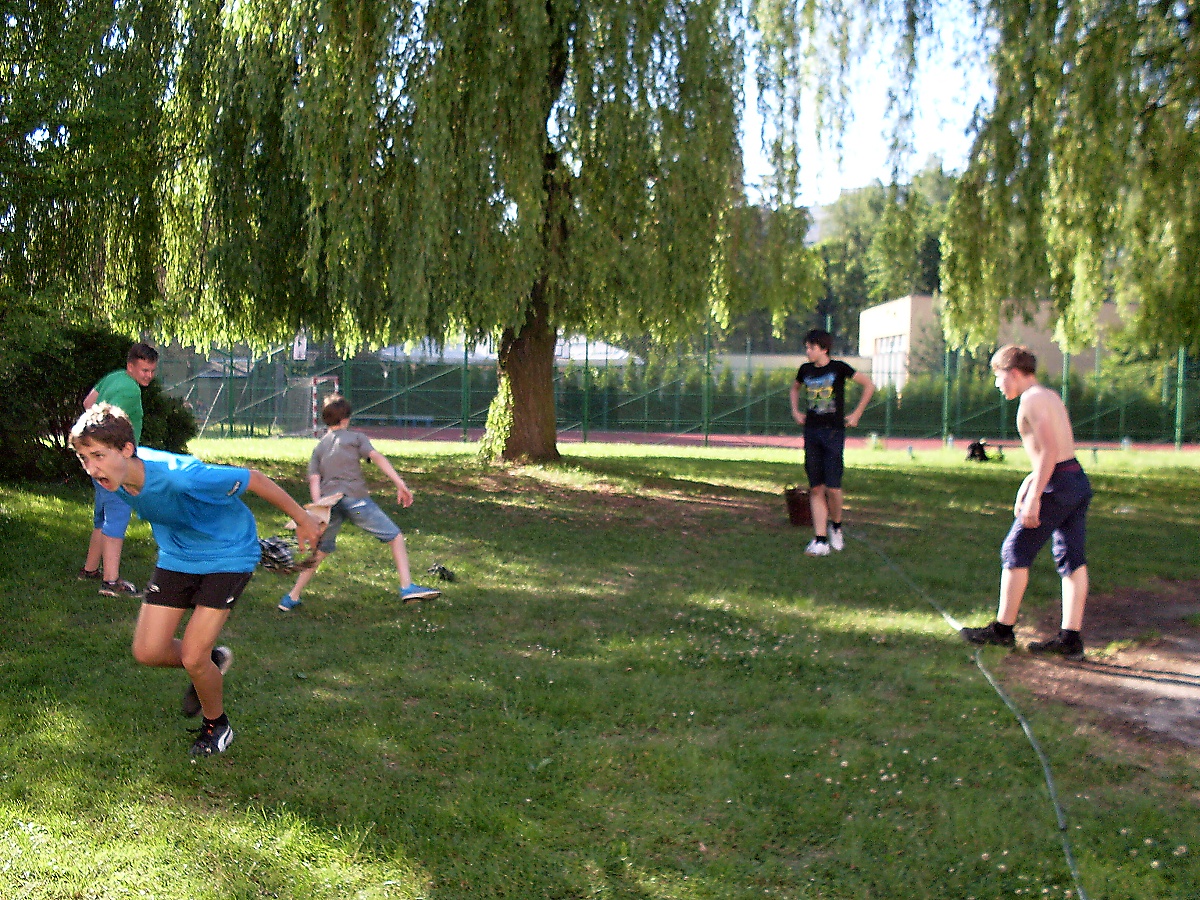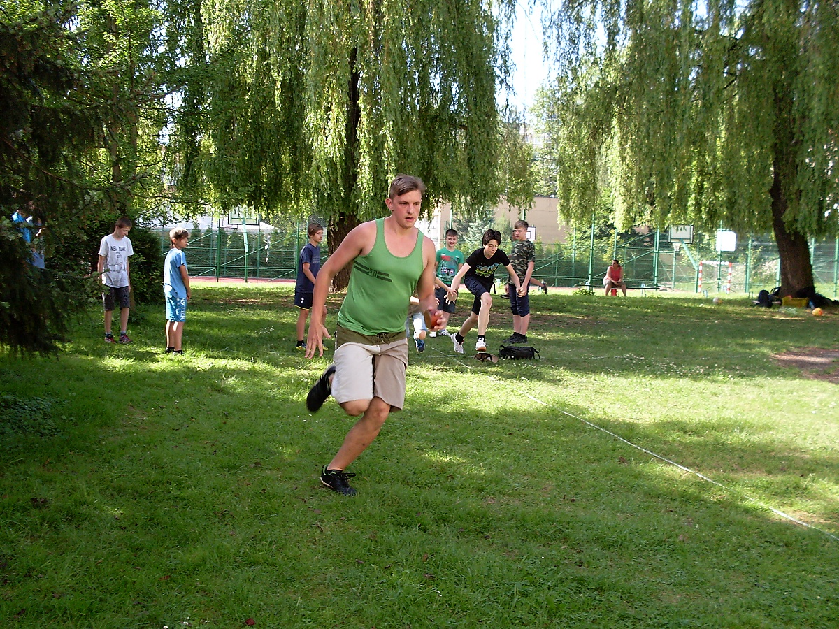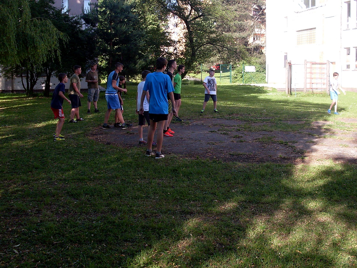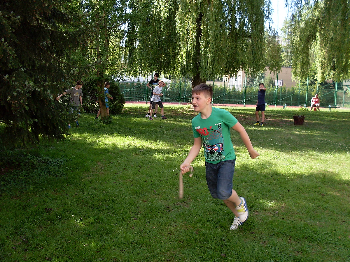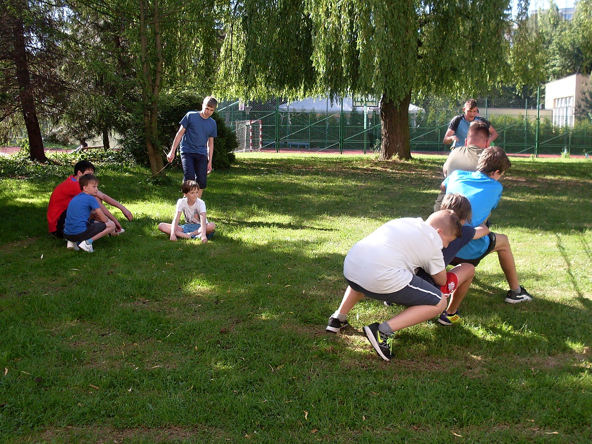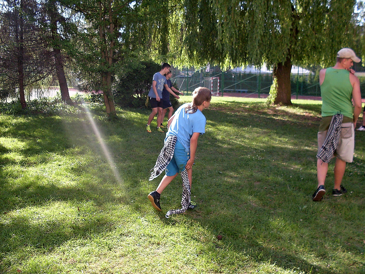 Je nás totiž méně než posledně. Později sice přijel „poškolák“ Vendy, ale stále nás je méně než při první části jarního RODEA. Jak je možné, že nezúčastnění (na smrt nemocní jsou omluveni), nechali svoji družinu na holičkách? Kromě Vítka, co přinesl přihlášku na tábor, se nikdo další z podniku neomluvil. Co nám zbývá? Odehrát měření sil družin v počtu dvanáct. Je strašlivé horko!