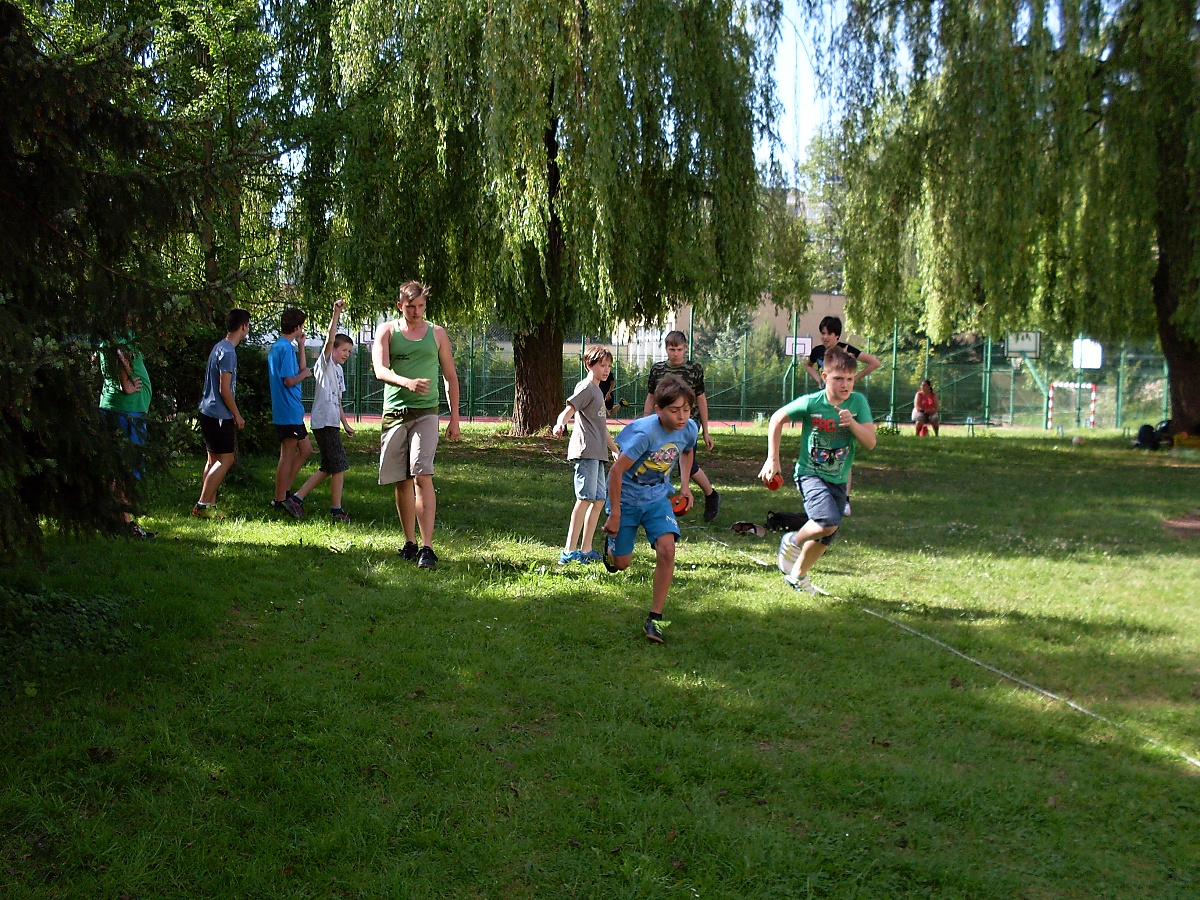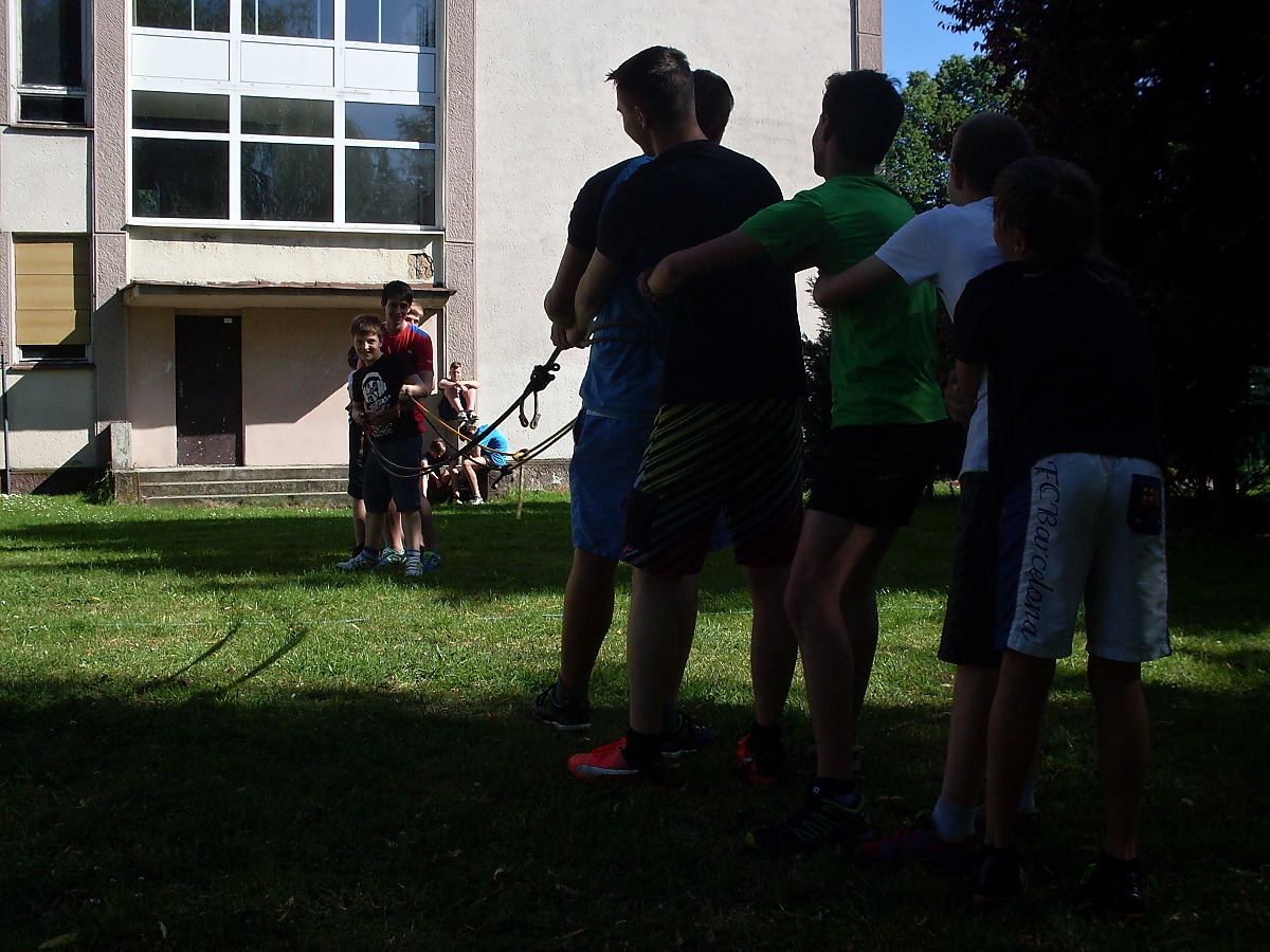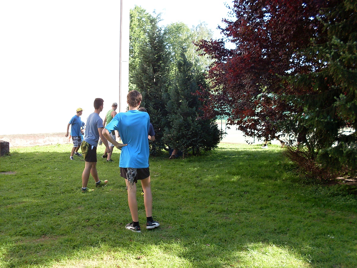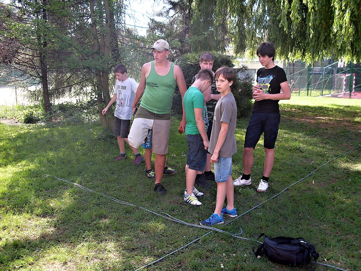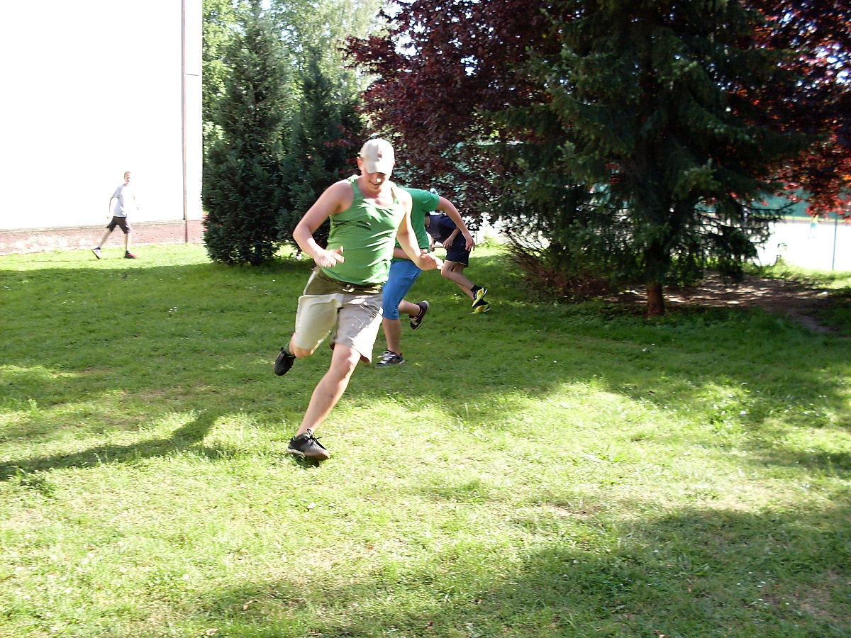 Je nás totiž méně než posledně. Později sice přijel „poškolák“ Vendy, ale stále nás je méně než při první části jarního RODEA. Jak je možné, že nezúčastnění (na smrt nemocní jsou omluveni), nechali svoji družinu na holičkách? Kromě Vítka, co přinesl přihlášku na tábor, se nikdo další z podniku neomluvil. Co nám zbývá? Odehrát měření sil družin v počtu dvanáct. Je strašlivé horko!