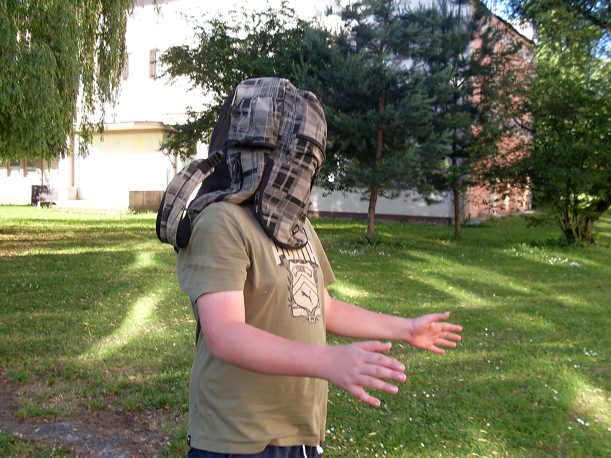 „V posledním závodě budete potřebovat šátky!“ Aha! Shrek šátek nemá. A kupodivu ani nikdo jiný náhradní šátek nemá! A tak si Shrekíno vysypal batoh, zbytky lupínků a arašídů vymetl a tlumok si narazil na hlavu. Shrek není ovšem jediný, kdo si nenosí na oddílové podniky povinné věcičky. Jiný výtečník má omotané kolem hlavy Dodovy galaty. Hrajeme hru s názvem „Kde je Kristus?“. Oddíl jde nevidouc za zvukem píšťalky. Tuto hru nemá rád Júňo a dnes opět potvrdil, že mu vůbec nesedí. K píšťalce dorazil jako poslední, naprosto vykolejený.