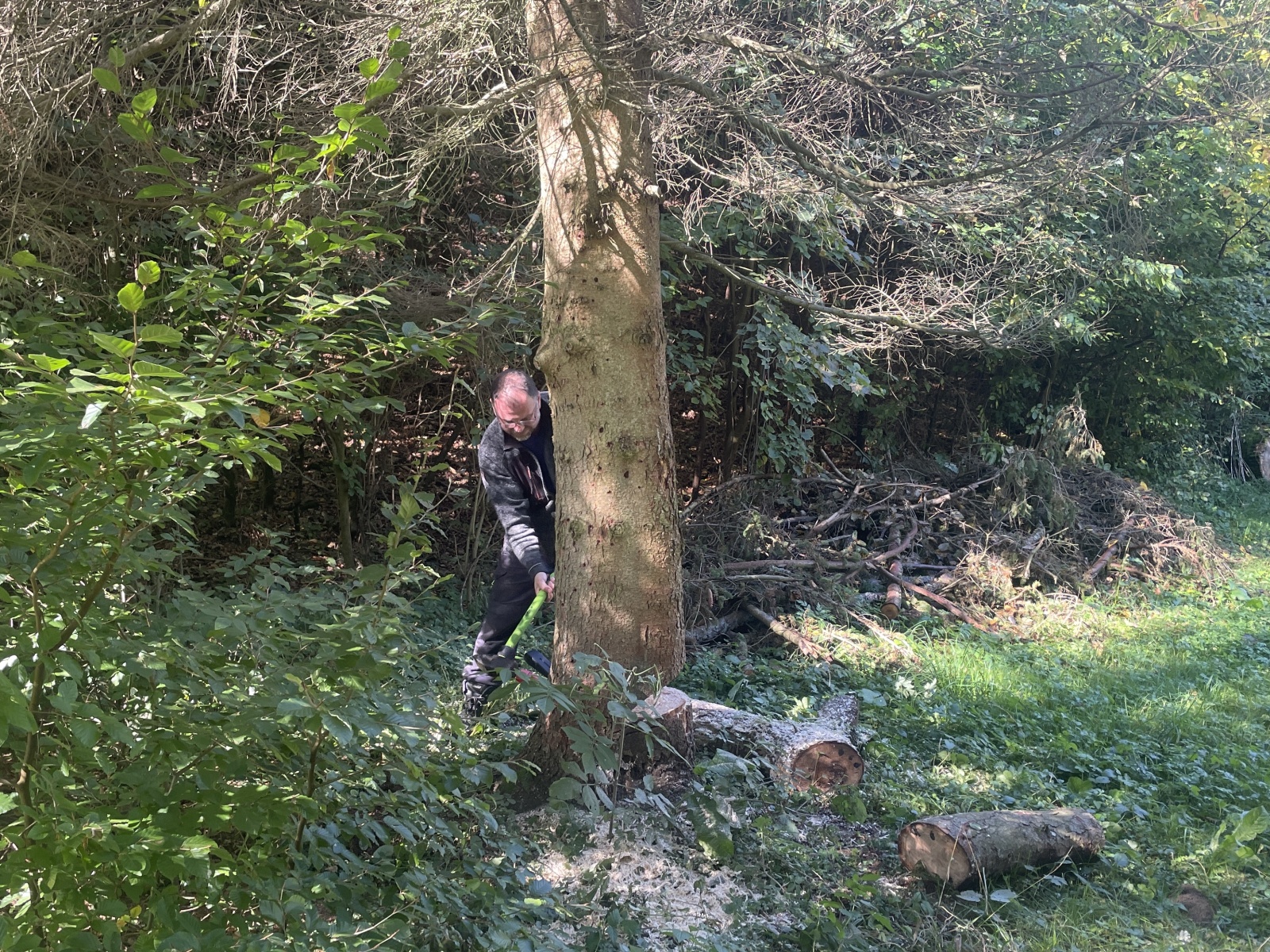 - kácíme jeden suchý smrk u studny. Hned jej také zpracováváme na palivové dřevo.