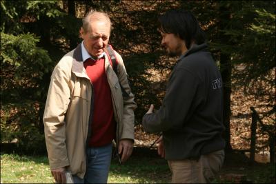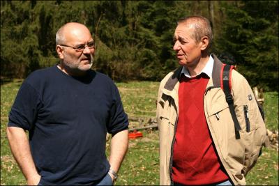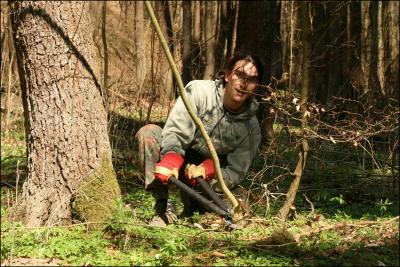 | Toncek Maká s Vitasem. Území, které se jim podařilo vyčistit, je slušně veliké. Nůžky dokážou ustříhnout kmínek do šíře 5 cm. Když jich ale ustřhnete dvacet, už ty ruky necítíte, já to tipuji na více než sto stromků. Upozornění pro greenpeace - jednalo se o náletové dřeviny, které do toho lesa nepatří a roky tam nic takového nerostlo. Byl to krásný smrkový les, kde odddíl na táborech hrál spoustu her. Poslední roky už nehrál v tomto lese nic, protože se do něj nedalo vstoupit. |