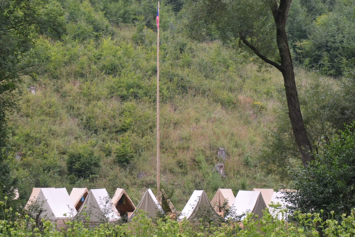 Táboříme od pátku 25. července do 10. srpna, opět oba oddíly Grifinovy TROJKY společně, v údolí Věžnického potoka, nedaleko hradu Bouzova, v malebném podhůří Drahanské vrchoviny – na rozhraní Moravy a Čech. Stavba tábora byla zvládnuta do prvního večerního nástupu. Především hoši z Olomouce si zpočátku pěkně mákli, protože Karviná dorazila až po poledni. (Ta kalvárie přesunu je zaznamenána v táborové kronice!). Letos všichni družiníci už spí ve stanech natažených na nových podsadách. Oddíl obsadil dvanáct stanů, každá družina po čtyřech, zbylých osm stanů připadlo Modrým rackům. Ti se postupně protočili během 17 dnů táborového života. A tak jediným, kdo své místo ve stanu nikdy neopustil, byl Mona. A to ne, že bych se chlubil, zkrátka se to nějak tak přihodilo. (Vysvětlení bude zveřejněno v odstavci "Resumé").