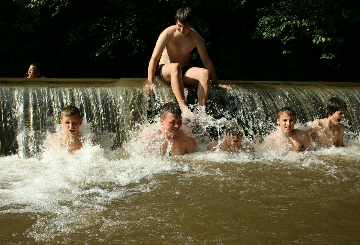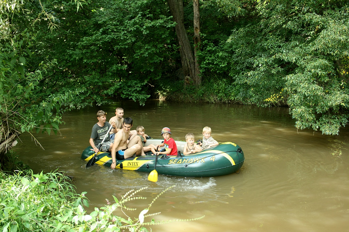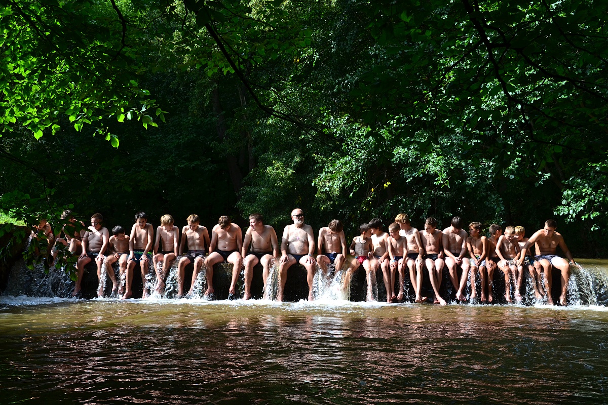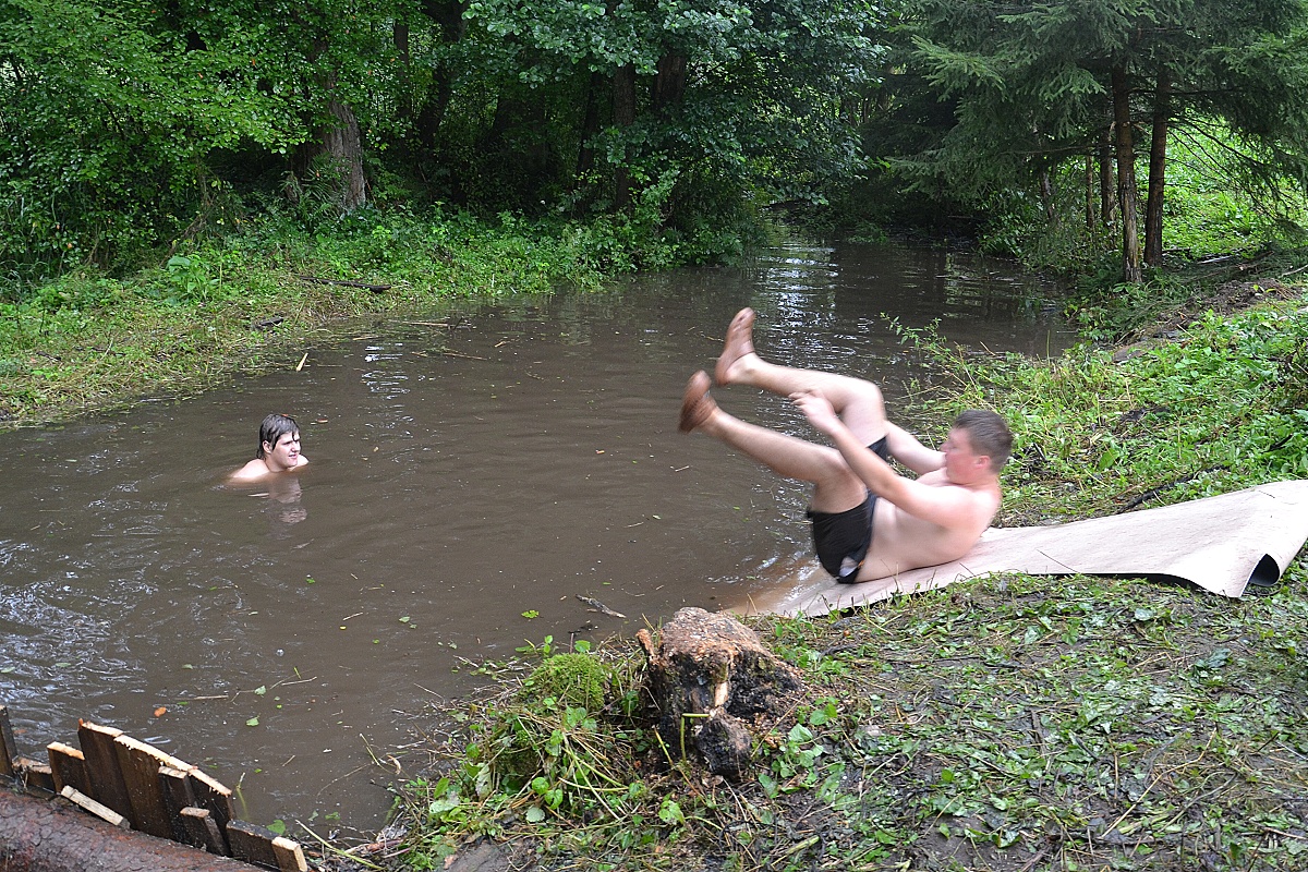 Na utěsnění dna už nebyla až do konce tábora vypátrána žádná síla a tak jsme se stále chodili koupat na dolní propustek, který ještě vyšperkovali veteráni při návštěvnímu dnu (Kamo a Miky) osazením obřího schodu. Letos, vyjma několika bikerů, vedl je Fili – jsme nenavštívili lesní oprán v Kladkách, protože zemědělci na „naší straně pláže“ pustili krávy až k rybníku. Několikrát jsme vzali s povděkem návštěvu Třebůvky a vykoupali se u náhonu k pile, kde proběhly i vodní radovánky na raftu.
