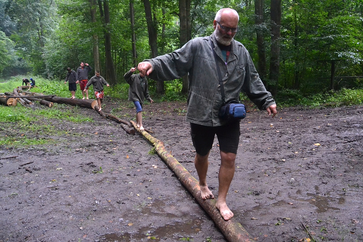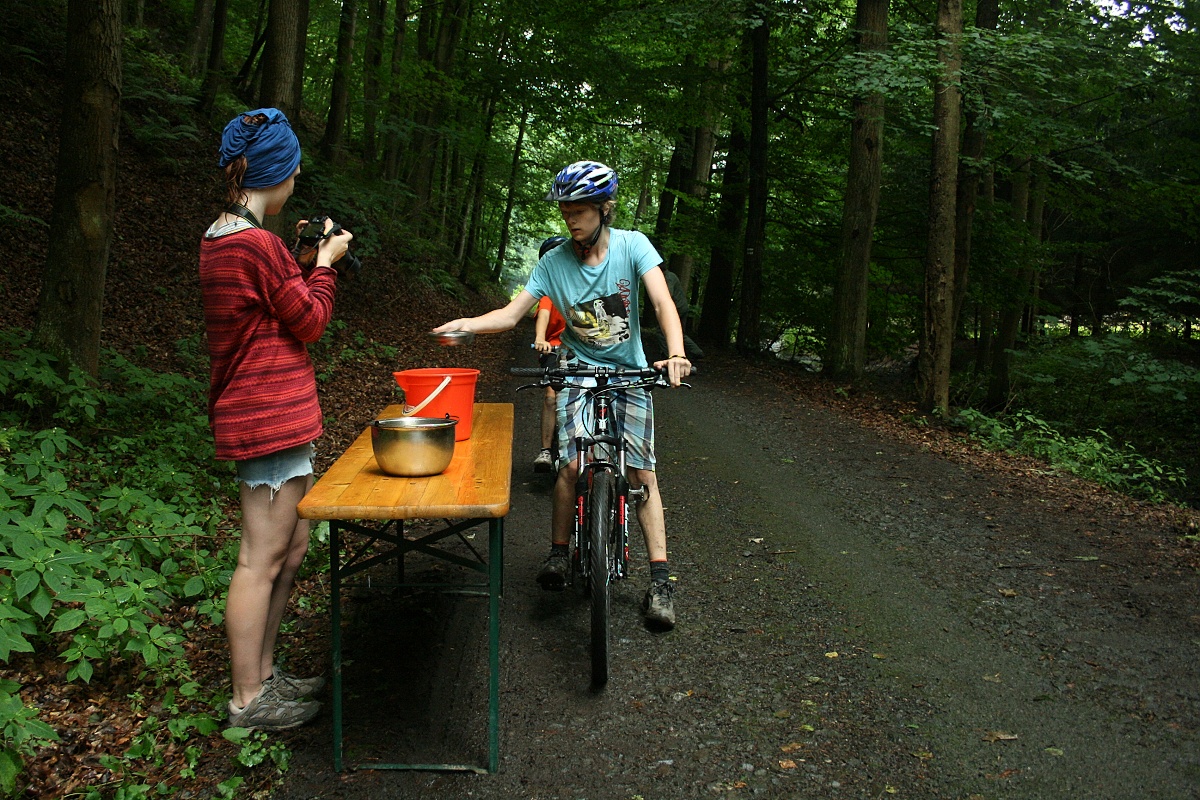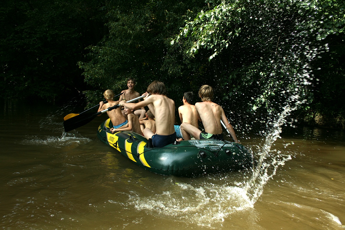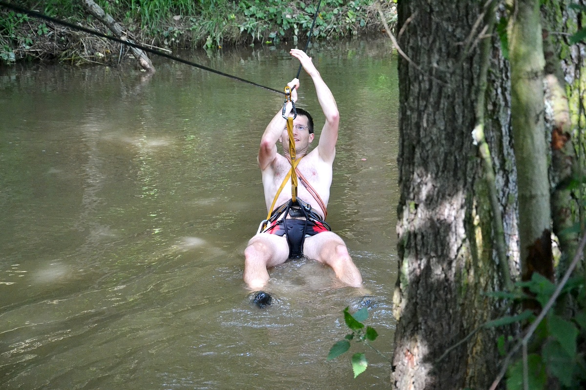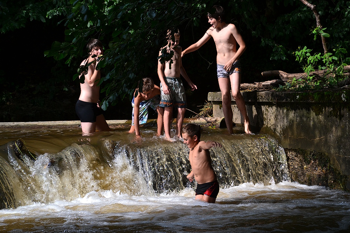 Na utěsnění dna už nebyla až do konce tábora vypátrána žádná síla a tak jsme se stále chodili koupat na dolní propustek, který ještě vyšperkovali veteráni při návštěvnímu dnu (Kamo a Miky) osazením obřího schodu. Letos, vyjma několika bikerů, vedl je Fili – jsme nenavštívili lesní oprán v Kladkách, protože zemědělci na „naší straně pláže“ pustili krávy až k rybníku. Několikrát jsme vzali s povděkem návštěvu Třebůvky a vykoupali se u náhonu k pile, kde proběhly i vodní radovánky na raftu.