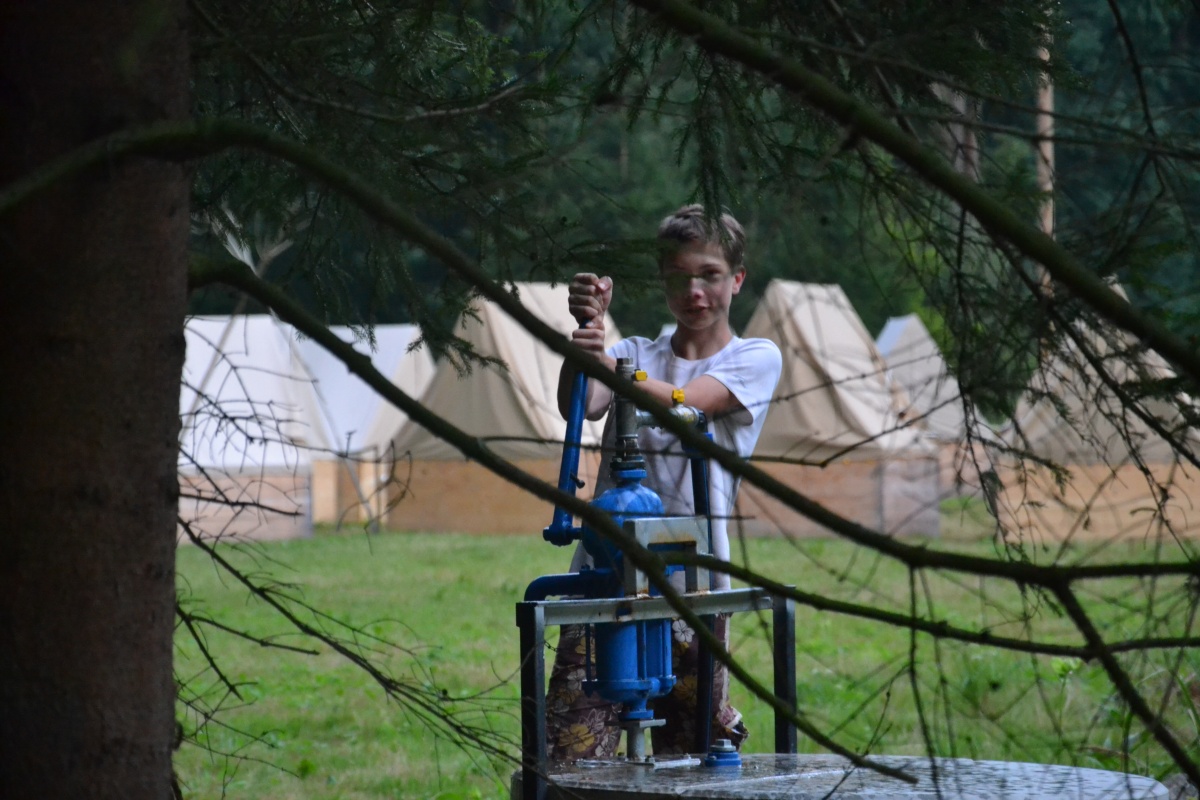 Zde je nutno připomenout jinou aktivitu Modrých racků, se kterou jsem se doposud ve svém (a protože mám už 50 let! – tak o to silněji to říkám – píši!), tábornickém životě nesetkal, ačkoliv jsem o tom několikrát četl, a různé návody prostudoval. Vzhledem k situaci, já nevím jak bych to nazval, zkrátka, málo pršelo. Celý rok málo pršelo. A studna, pod hranou Sluneční hory, dávala občas najevo, že je na dně. A Lišáci se chtějí koupat. A není voda. Ani na umytí nádobí. A tak trojice – ve složení Antek, Kassa a Bubák, koupila předepsané „ingredience“, a pomocí vápna, písku, dřevěného uhlí, plátna a provrtaného kbelíku, zřídila filtr na pitnou vodu. Počin naprosté dokonalosti. Asi jako rozdělání ohně třením dvou dřev. Táborová služba pak následně pomocí konve doplňovala vodou z potoka příslušné zařízení, z kterého odkapávala do příslušných nádob křišťálově čistá voda. Dělají to tak vojáci, geologové, vodáci, lovci, poutníci a kočovníci, Indiáni a – my! Nikomu se nic nepřihodilo, žádné zdravotní komplikace, až se nabízí otázka, dostali jsme se tak daleko, že bychom pili vodu z potoku?