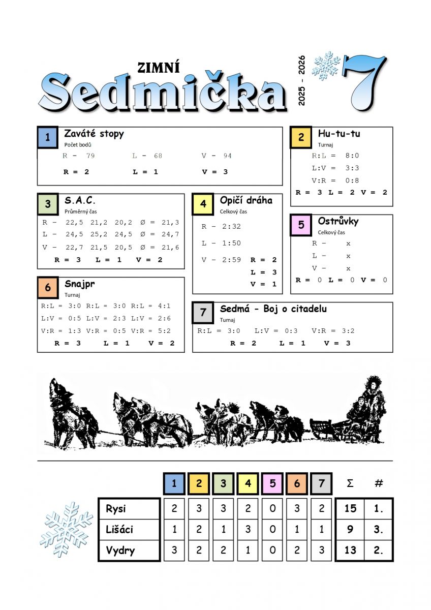 - jako poslední, sedmou, soutěž jsme odehráli Boj o citadelu: V:R = 2:3, R:L = 3:0, L:V = 0:3