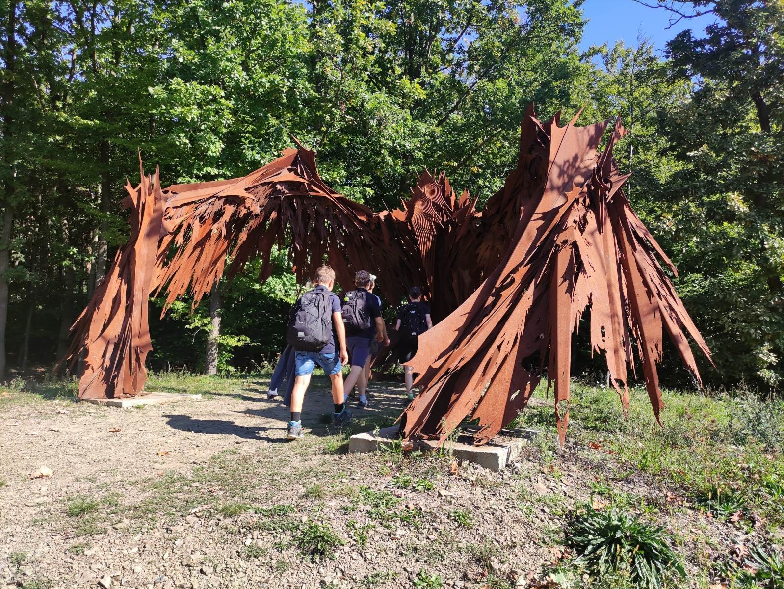 Sestupujeme do údolí a u Běleckého mlýna se napojujeme na žlutou turistickou značku. Míjí nás skupina elektrocyklistů. Naše kroky vedou podél obory s elektrickým ohradníkem. Drahnou chvíli hoši zkouší, jak ohradník brní přes list trávy. Nikdo však nemá odvahu se ho dotknout napřímo. Ani já! Po chvíli zastavujeme u monumentální skulptury Ohnivý anděl. Autorem je stejný umělecký sochař, který stvořil Kříž srdce. Ano, je to stejný autor, který stvořil vetřelce, naklánějícího se ze střechy jednoho z domů v Šemberově ulici. Ke kříži to již máme kousek. Počet klád na hromadě nejpřesněji odhadli Lišáci (V, R). Míjíme pozorovatelnu zvěře, která je ale znepřístupněna z důvodu napadení konstrukce dřevomorkou. U kříže obědváme. Je krásné teplo, možná až moc. Kdo je autorem monumentálního kříže? Tak zněla moje otázka, když jsme místo opouštěli. Jediný Maty věděl správnou odpověď Dostál. Jeho podpis je svářečkou vypálen u paty kříže. Kdo nevěří, ať tam běží – a taky že ano!