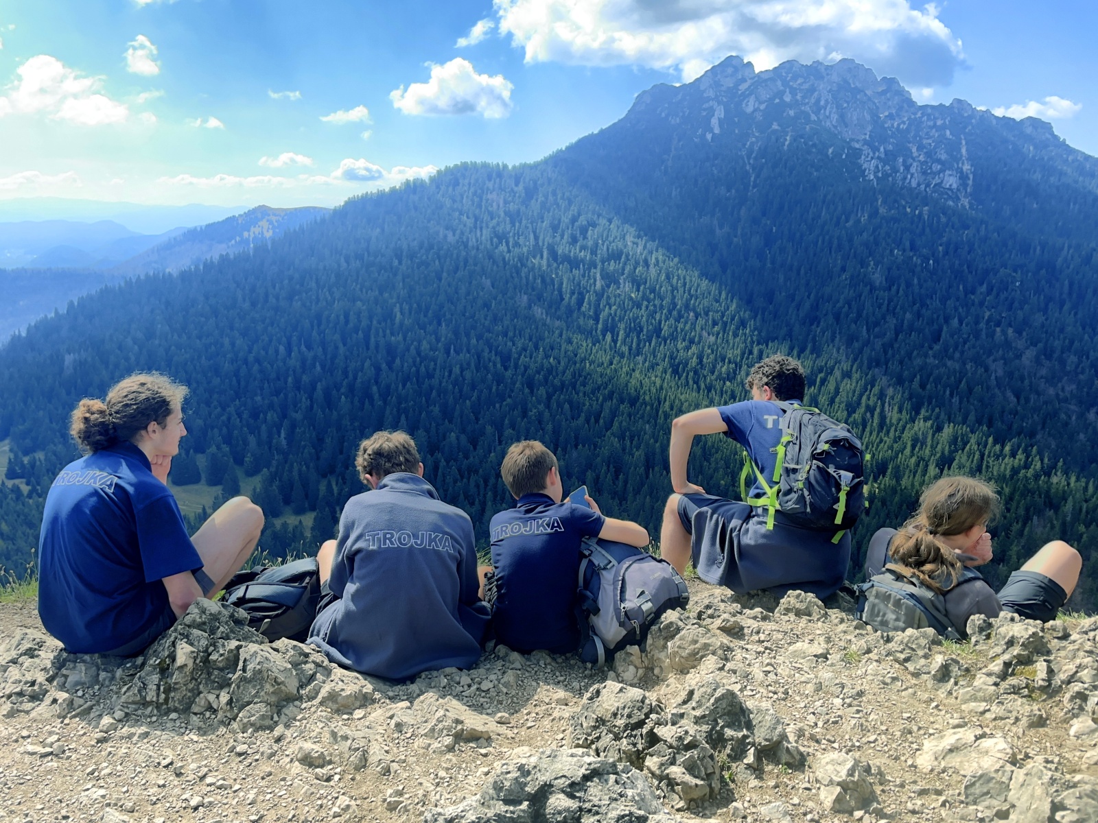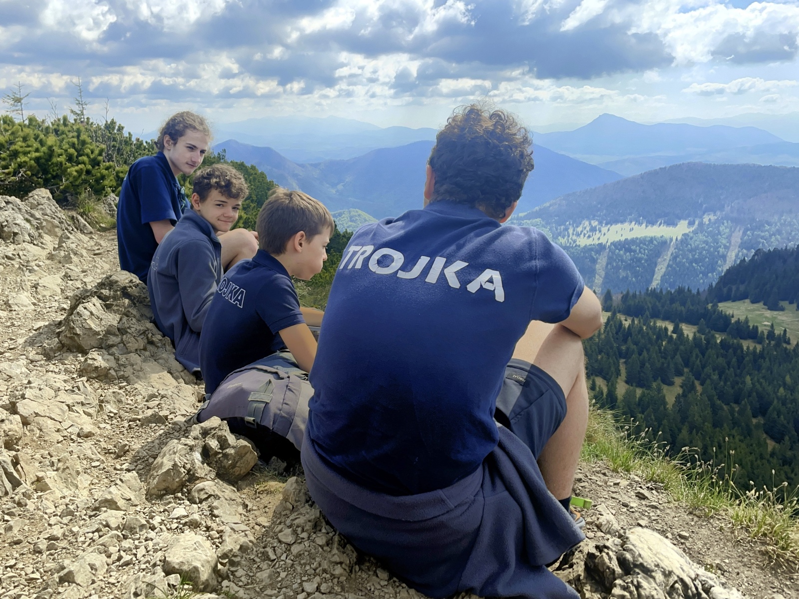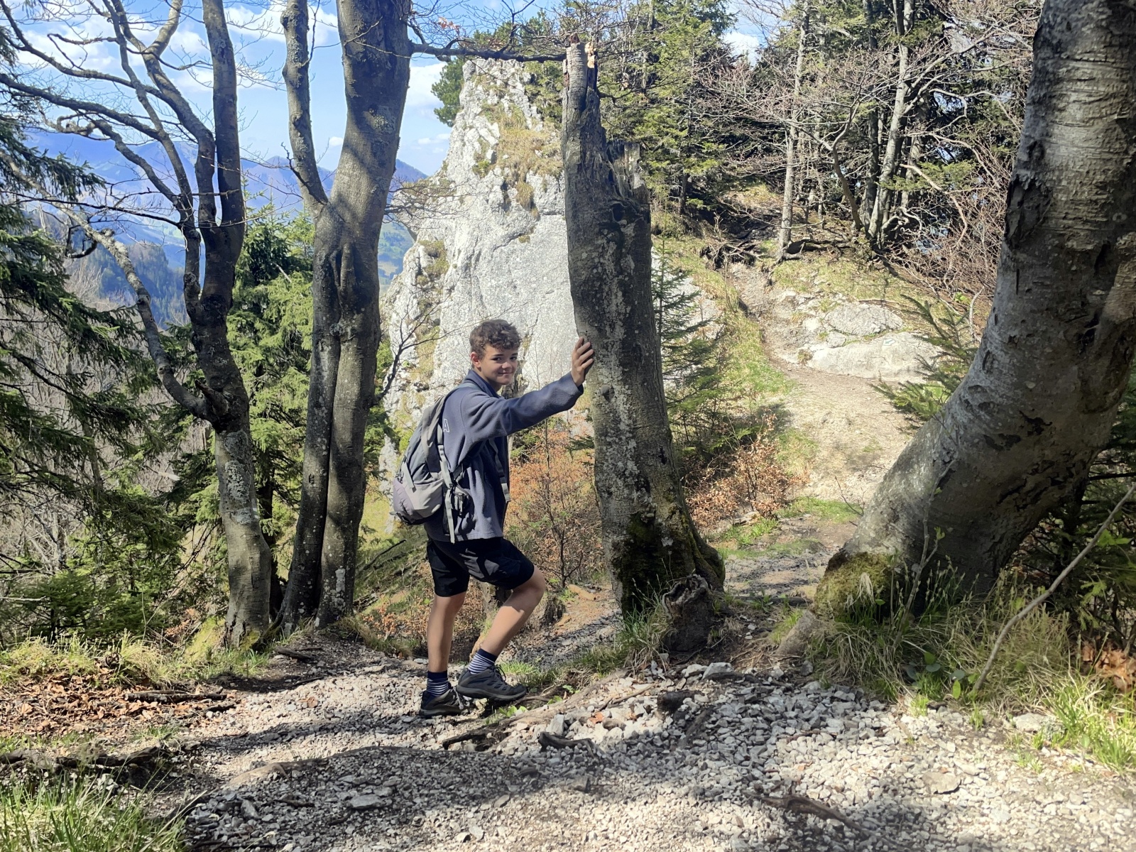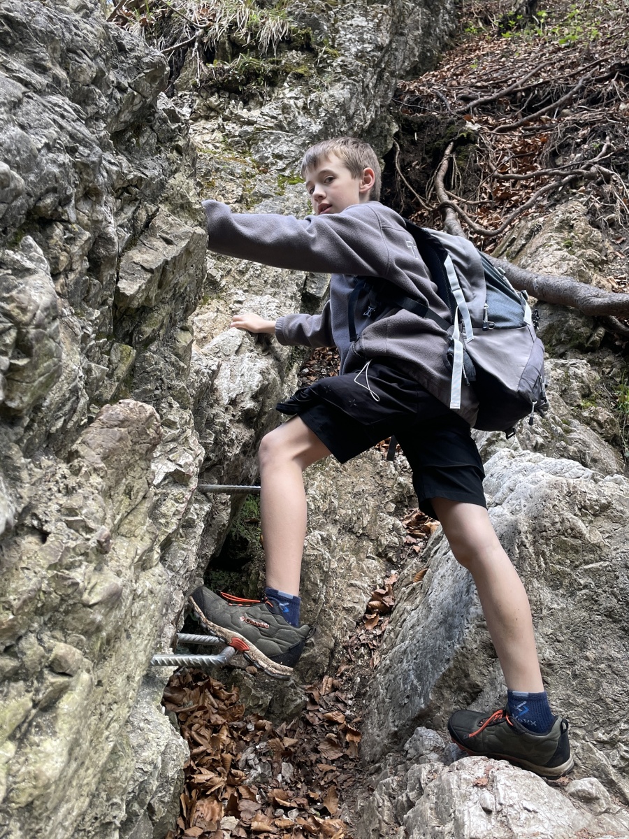 Příliš strmé, příliš kamínků, které uklouzávají a postupně turisté, většinou Poláci, v protisměru. V životě jsem touto cestou nešel nahoru, je to asi nejhorší varianta, která se dá zvolit. Kubka, Honza a Talík si prozpěvují nějaké písně z minecraftu. Asi aby vytočili funějící turisty, kteří se plahočí proti nám. U jednoho stromu se zeptám Talíka na jeho název. Tak dub, buk ani smrk to není, nevím, asi Řehoř. Nevím, jestli si ten chlapec dělá srandu ze mě, nebo opravdu neví. Ale nepoznat lípu to je ostuda. U dalšího stromu řekl, že to je Jarek Maďal. Vtipálek.