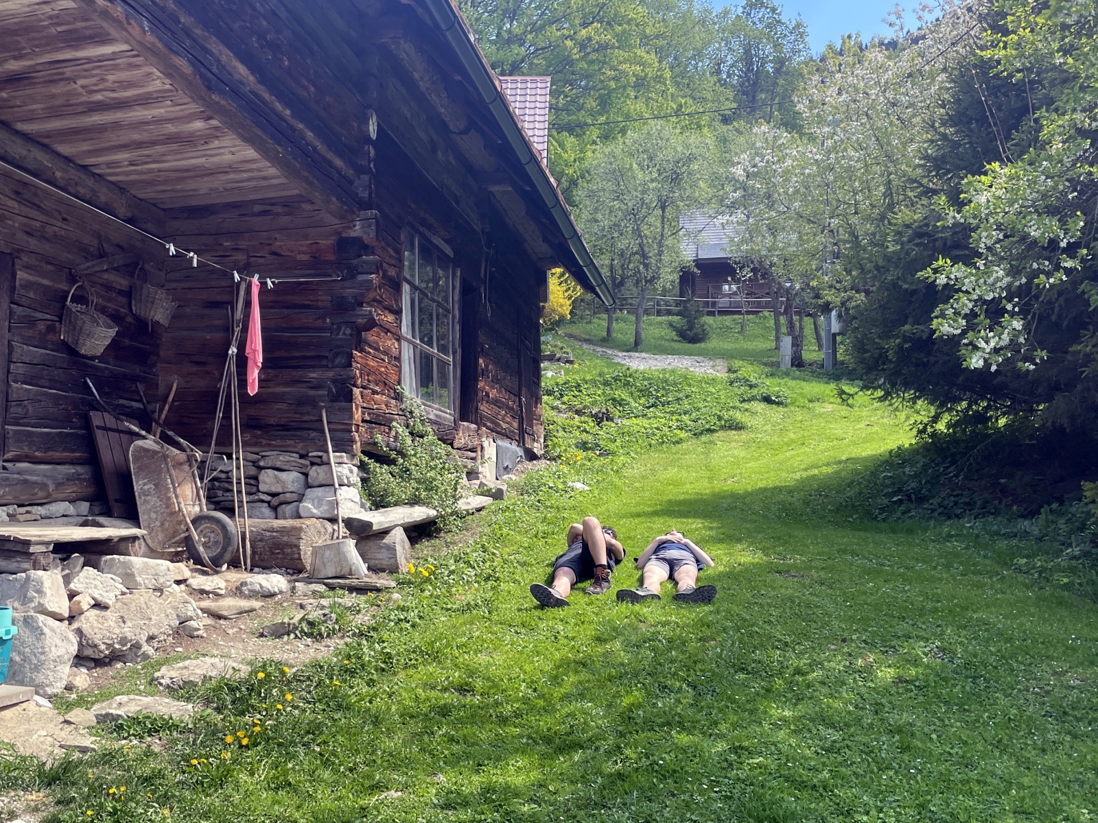 Do cíle to máme už jen 2,5 kilometrů, příjemnou cestou přes louky. Neujdeme ani 50 metrů a já zjišťuji problém. Na mé botě odletěla podrážka. Skoro celá, od paty až do poloviny boty. Jít se s tím nedá. Prohledávám lékárničku a nacházím takovou mizernou, 1 cm širokou náplast. Přes moji nedůvěru, náplast vydržela zbytek cesty.