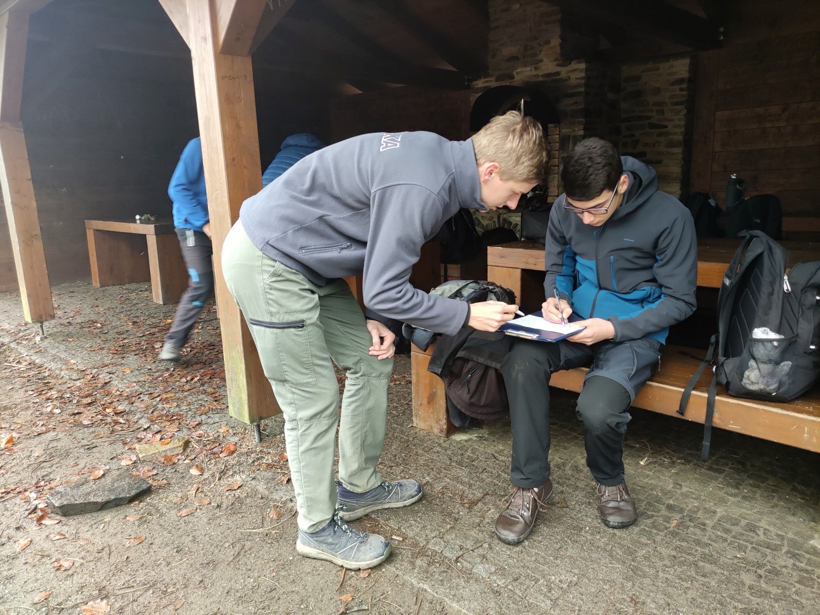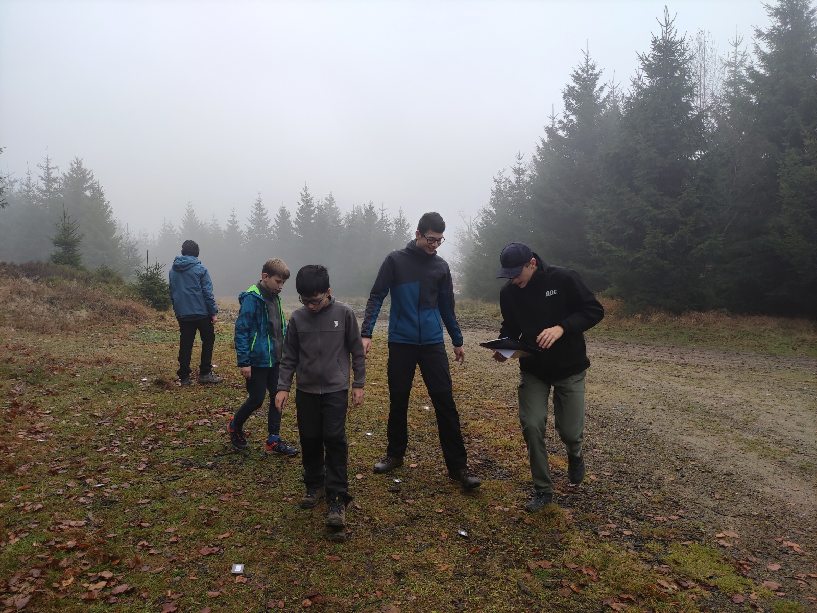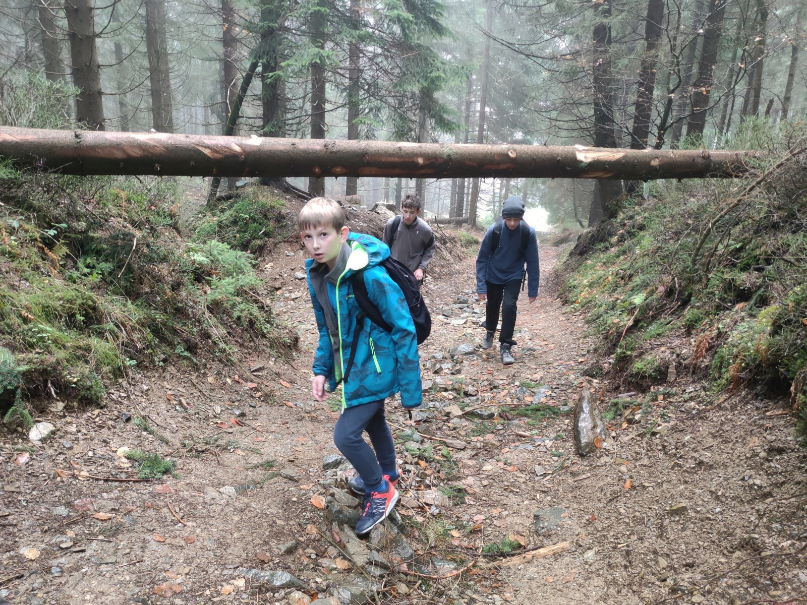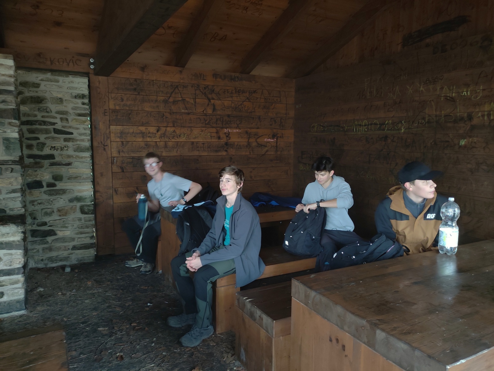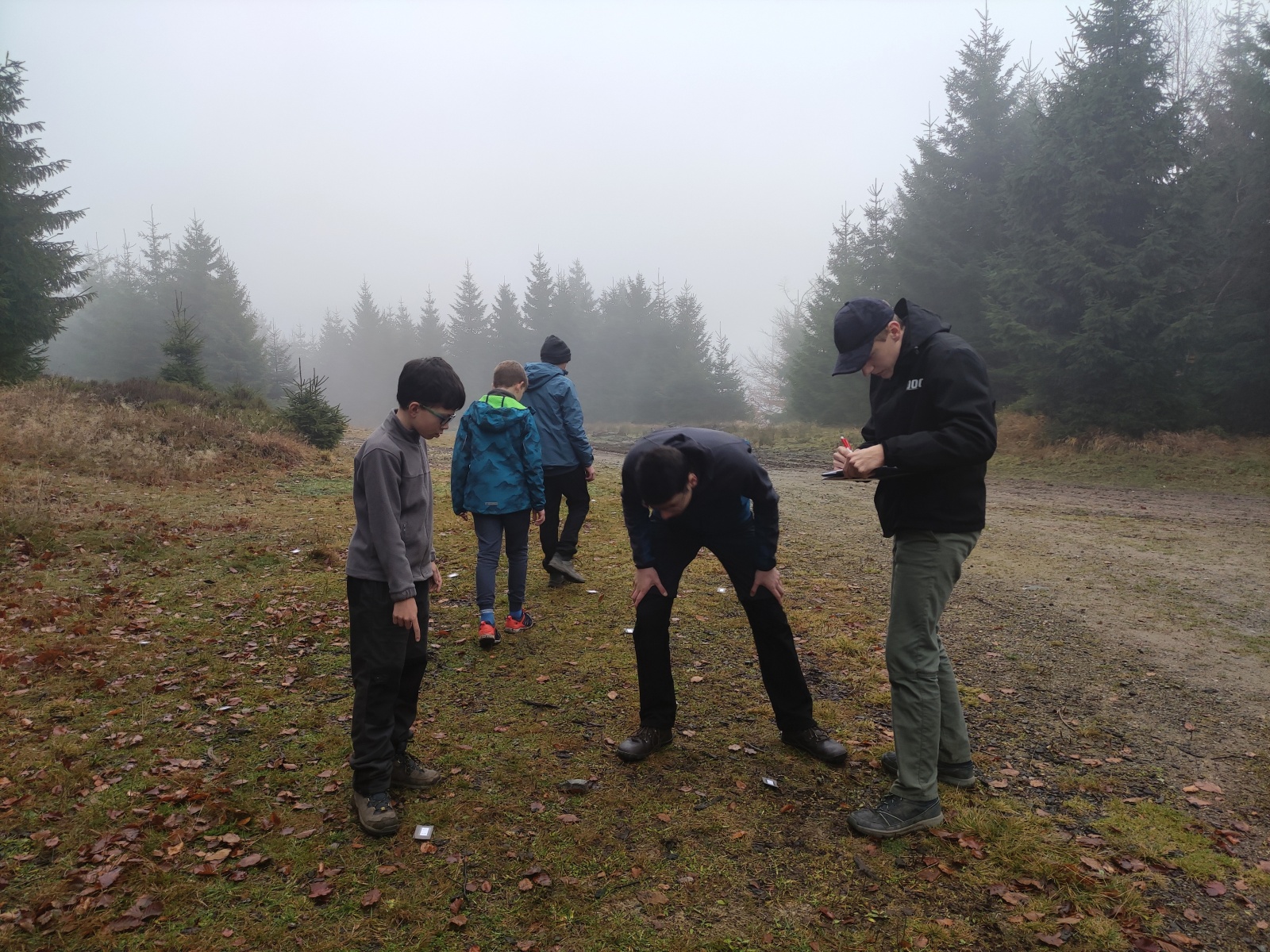 Cestou míjíme tlupu, která musela „urobit prezenčku“. „Pane učiteli, dejte si s námi!“ volali na mě… První zastávku mám v plánu na rozcestí nedaleko Císařské lovecké boudy, kde je velký přístřešek, sloužící jistě i jako útulna. Moc útulno tu ovšem není. Lidi jsou zkrátka prasata. Ale kteří?? První soutěží je sestavení jednoduché zprávy z lístků ve znění „Existují dva druhy náplastí. Ta, která nejde přilepit, a ta, která nejde odlepit.“ Klasický Murphyho zákon! Pořadí R, V, L. Začínám sbírat lístečky. Bez vyzvání mi pomáhají Dan, Pedro a Simon – jsou odměněni známkou! Pokračujeme k cíli nějakých dva a půl kiláčku. Kurnik šopa, tady je lidu! Fronta na jídlo až ven, stoly obsazené. Nejprve čekáme venku a po zhruba půlhodince se situace zlepšila. Dokonce si sedáme k jednomu většímu stolu. Jen Pedro čeká u výdeje jídla. Objednal si Bláznivé mumie z Halloweenského menu. Nakonec na ně čekal čtyřicet minut!