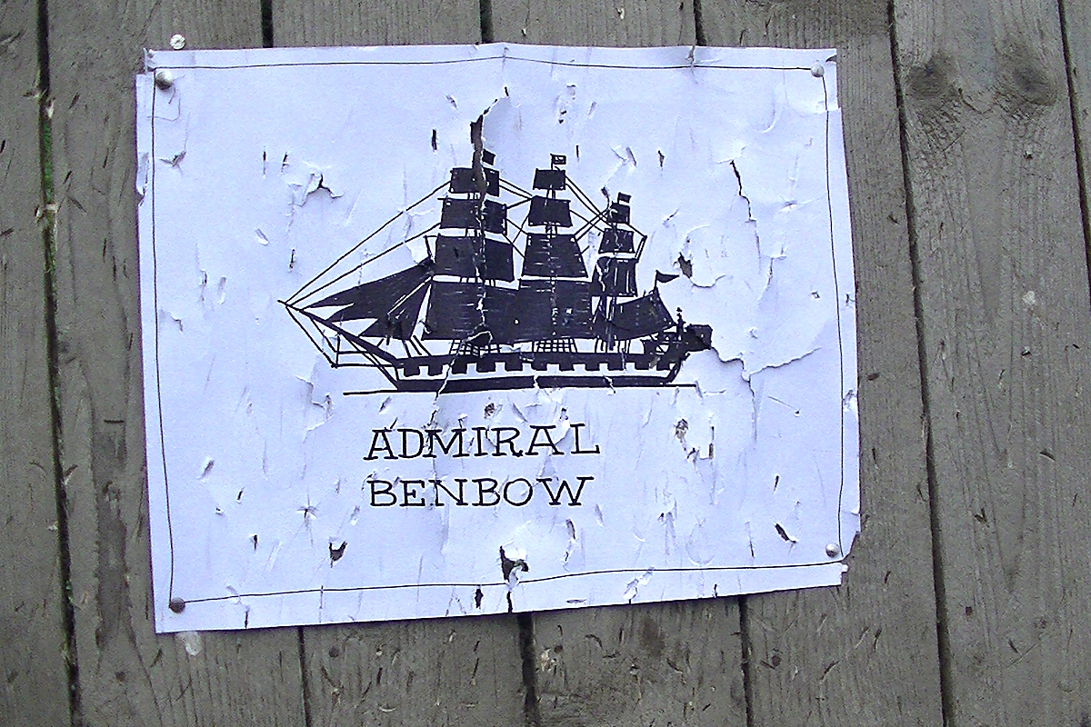 Černý pes – Billy Bones „vyprovází“ z hospody piráta „Černého psa“ a sekne po něm tesákem. Ten se zabodne do vývěsního štítu hostince „U Admirála Benbowa“.